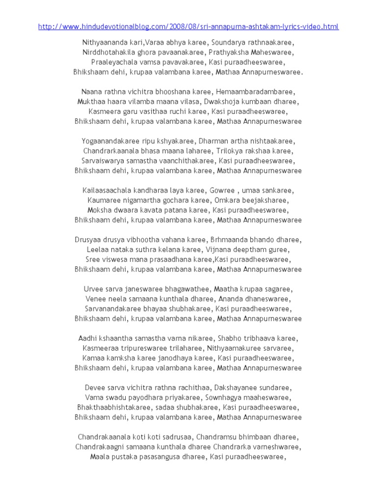 Annapurna Ashtakam Lyrics In Hindi - नित्यानन्दकरी वराभयकरी सौन्दर्यरत्नाकरी निर्धूताखिलघोरपावनकरी प्रत्यक्षमाहेश्वरी । घोरपापनिकरी प्रालेयाचलवंशपावनकरी. Annapurna Ashtakam Lyrics In Hindi / ⇒ annapurna ashtakam in sanskrit / hindi mambalam sisters.